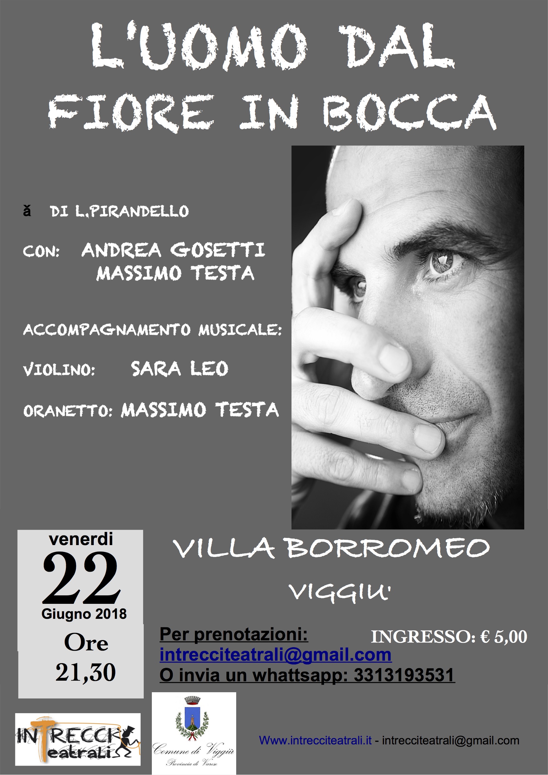 In occasione della rassegna di Teatro Estivo della Compagnia IntrecciTeatrali Venerdì 22 Giugno alle ore 21.30, nella suggestiva cornice dI Villa Borromeo andrà in scena la performance teatrale “L’UOMO DAL FIORE IN BOCCA”.
